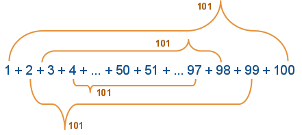Gdy doda się do siebie cyfry od 1 do 100 dwa razy (zapisując je pod sobą raz od przodu, raz od tyłu), to 100-krotnie doda się do siebie liczbę 101, czyli uzyska wynik 10100.